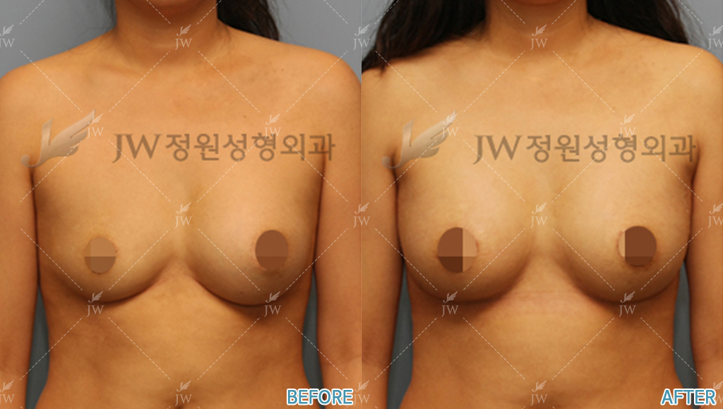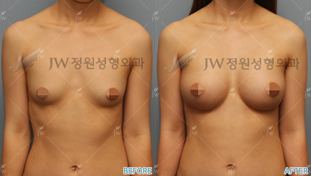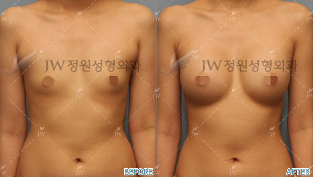 Before after pictures from breast surgeries at JW Beauty Clinic in Seoul, South Korea.