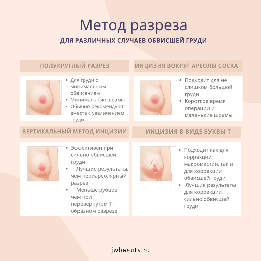 Во время полной подтяжки груди, в зависимости от тяжести операции, врач рассматривает четыре вида разрезов: серповидный разрез (в форме полумесяца и размещается над ареолой), разрез по ареоле (круглый и размещается над ареолой), вертикальный разрез (вертикальная линия от складок груди к ареоле) или Т-образный разрез – применяется в случае сильного обвисания.