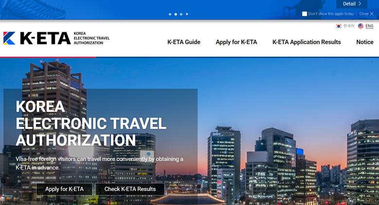 Это единственный веб-сайт для регистрации K-ETA. Обязательно используйте эту ссылку, так как могут быть мошеннические веб-сайты, выдающие себя за официальный сайт K-ETA. Обычно они требуют оплату более 10,000 вон. Оплата K-ETA составляет 10 000 южнокорейских вон.