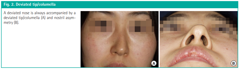 Асимметрия кончика, отклоненная колумелла и образовавшаяся асимметрия ноздрей, в первую очередь вызвана проблемами нижнего латерального хряща. Примеры проблем с нижним латеральным хрящом включают отклонение медиальных наконечников, несоответствие высоты медиальных наконечников и асимметрию или деформацию латеральных наконечников.