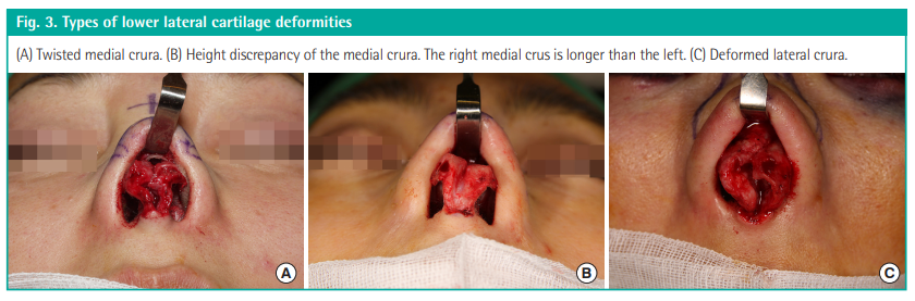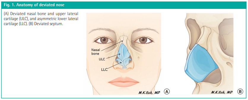 Основными процедурными компонентами коррекции искривления носа являются: остеотомия для коррекции искривления костной ткани, коррекция искривления перегородки, манипуляции с дорсальной перегородкой для коррекции отклонения верхнебокового хряща и коррекция функциональных проблем (манипуляции для коррекции коллапса внутреннего клапана и гипертрофии нижней носовой раковины). Исправление асимметрии кончика и ноздрей невозможно переоценить, потому что, если асимметрию кончика и ноздрей не исправить, пациенты вряд ли дадут положительную оценку с эстетической точки зрения. Асимметрия кончика, отклонение колумеллы и результирующая асимметрия ноздрей в первую очередь вызваны проблемами с нижним латеральным хрящом, которые включают отклонение медиального наконечника, несоответствие высоты срединного наконечника и асимметрию или деформацию латерального наконечника. Тем не менее, отклонение каудальной и дорсальной перегородок, которое является более важной этиологией, также должно быть исправлено. Для коррекции деформации нижнего латерального хряща требуется колумеллярный трансплантат, коррекция любого несоответствия в высоте медиального наконечника или коррекция латерального наконечника. Чтобы исправить отклонение каудальной перегородки, используются ее укорочение, изменение положения или техника разрезания и наложения швов. Операция по исправлению отклонения дорсальной перегородки выполняется путем комбинирования надрезанного и шинирующего трансплантата, расширяющего трансплантата и / или техники так называемого шва. Кроме того, при исправлении искривленного носа не следует упускать из виду коррекцию асимметрии края крыльев и основания крыльев, чтобы добиться симметрии кончика носа и общего носа.