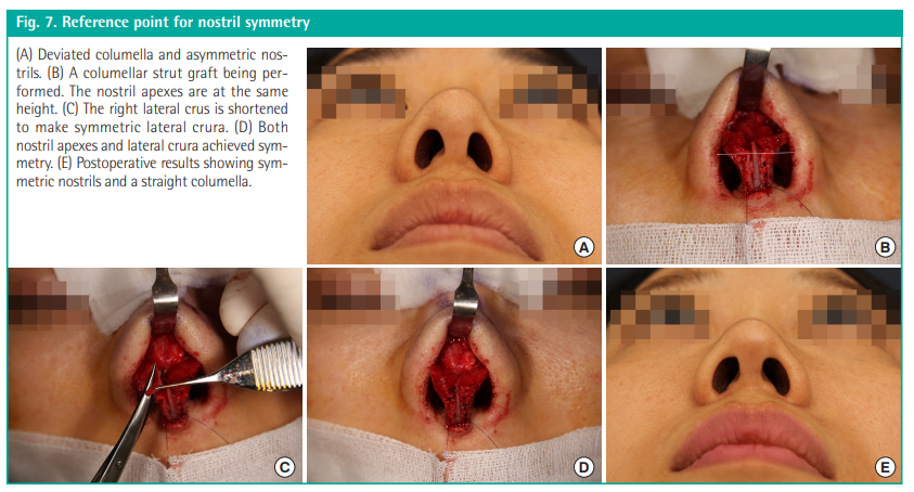 При выполнении трансплантата колумеллярной стойки верхушка ноздри самый важный ориентир, чтобы сделать ноздрю симметричной. Хирург должен прикрепить медиальный наконечник к колумеллярному трансплантату с верхушки ноздри, расположенной по обе стороны от одиночной горизонтальной линии. Таким образом, одинаковая высота левой и правой ноздри могут быть получены, и любая сохраняющаяся асимметрия крыльев или латерального наконечника может быть легко исправимой с помощью наложения швов или сегментарной резекции. Напротив, если позиция купол хряща вместо высоты ноздри используется в качестве ориентировочной точки и регулируется первой, оставшаяся асимметрия в высоте ноздрей исправить будет нелегко. Различия в высоте медиальных ножек с обеих сторон вызывают асимметрию ноздрей, потому что высота верхушки ноздри слева и справа становятся разными. Чтобы исправить это, укорочение более длинной медиальной ножки или удлинение более короткой необходимо выполнить.