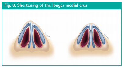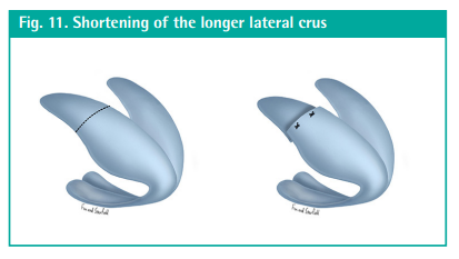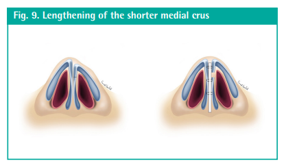 Создается пространство путем удаления колумеллярного сегмента в более короткой медиальной ножке и трансплантат стойки колумеллы. Деформированные латеральные ножки или асимметричные латеральные ножки также способствуют асимметрии кончика и отклонению колумеллы.
