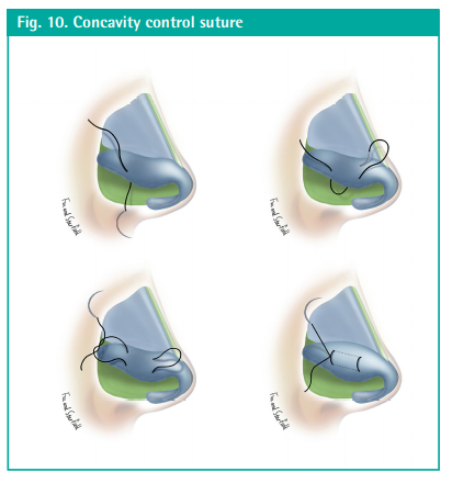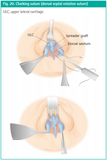 Фиксирующий шов – это горизонтальный матрасный шов, фиксируемый в более головной части верхнего латерального хряща, которая проходит через более каудальную часть искривленной спинной перегородки и расширяющего трансплантата. Таким образом, этот шов может подтянуть искривленную спинную перегородку к средней линии. Затем к выпрямленной спинной перегородке подшивают противоположный верхний латеральный хрящ.