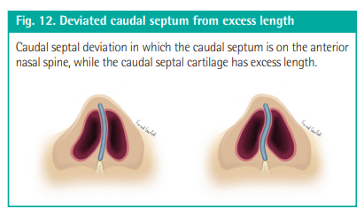 Механизм, посредством которого отклонение каудальной перегородки вызывает отклонение колумеллы состоит в том, что искривленная каудальная перегородка перемещает медиальный наконечник латерально. Искривленная перегородка способствует отклонению кончика и колумеллы за счет бокового перемещения основания в нижнем боковом хряще и боковом наконечнике.