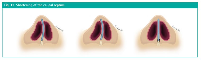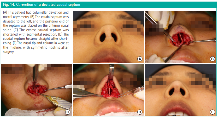 Переднезаднее отклонение каудальной перегородки корректируется следующим способом. В одном из типов, передний отдел носовой ости (ПОНО) расположен на средней линии, а каудальная перегородка расположена на ПОНО, а хрящ каудальной перегородки изогнут по линиям С или S из-за своей чрезмерной длины. Коррекция этого типа отклонения требует укорочения каудальной перегородки и может выполняться посредством сегментарной резекции каудальной перегородки или методом разрезания и наложения швов.