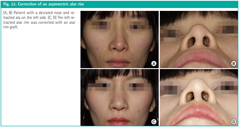 Асимметричный край крыльев (втянутый край крыльев) или асимметрия основания крыльев может вызвать асимметрию ноздрей при искривлении носа. Не следует упускать из виду коррекцию этих факторов, чтобы добиться симметрии кончика носа и ноздрей при исправлении искривленного носа. Методы коррекции втянутого края крыловой кости – это каудальная ротация нижнего латерального хряща, трансплантаты края крыльев, латеральные стройные трансплантаты и композитные трансплантаты. Обычно асимметрию ширины крыловидного основания можно легко исправить, уменьшив более широкую сторону.