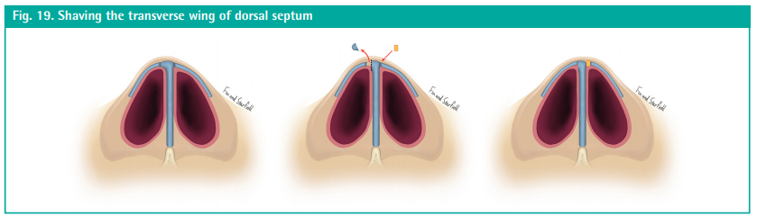 После выполнения подслизистой резекции и коррекции отклонения каудальной перегородки, отклонение дорсальной перегородки спонтанно улучшается. Выбор метода операции производится после изучения формы и степени оставшегося отклонения дорсальной перегородки. Хирургическими методами коррекции отклонения дорсальной перегородки являются наложение двойных матрасных швов, надрезание и шинирование трансплантатов, техника разрезания и наложения швов, расширительные трансплантаты и дорсальная перегородка. ротационные швы (закрывающие швы). Большинство процедур коррекции дорсальной перегородки выполняется путем сочетания нескольких из вышеупомянутых методов. Операционная техника, которую предпочитает автор, представляет собой комбинацию надрезного и шинирующего трансплантата (который дополнительно обеспечивает функциональность расширяющего трансплантата) и синхронизирующих швов.