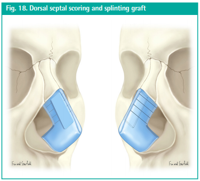 Хрящ дорсальной перегородки перемещают к средней линии, выполняя множественные насечки толщиной в одну треть на выпуклой стороне дорсальной перегородки. Поскольку предсказуемость низкая, а дорсальная перегородка ослабляется только за счет насечки, шинирующий трансплантат выполняется на противоположной стороне от места с надрезом. Шинирующий трансплантат дополнительно выполняет функции расширительного трансплантата. Распределительный трансплантат – очень важная техника, которая почти всегда включается в коррекцию дорсальной перегородки, и обычно она располагается на вогнутой стороне. Распределительный трансплантат выпрямляет искривленную спинную перегородку и расширяет втянутый латеральный хрящ вбок. Кроме того, он усиливает ослабленную из-за насечки или клиновидной резекции дорсальную перегородку, позволяет предотвратить или исправить инверсную V-деформацию и увеличить ширину внутреннего носового клапана. Оптимальным донорским участком является перегородочный хрящ, но также можно использовать ушной или реберный хрящ. Затонувший участок расправляют с помощью растянутого трансплантата на вогнутой стороне дорсальной перегородки, а поперечное крыло резецируют, если выпуклая сторона дорсальной перегородки показывает чрезмерную вогнутость.
