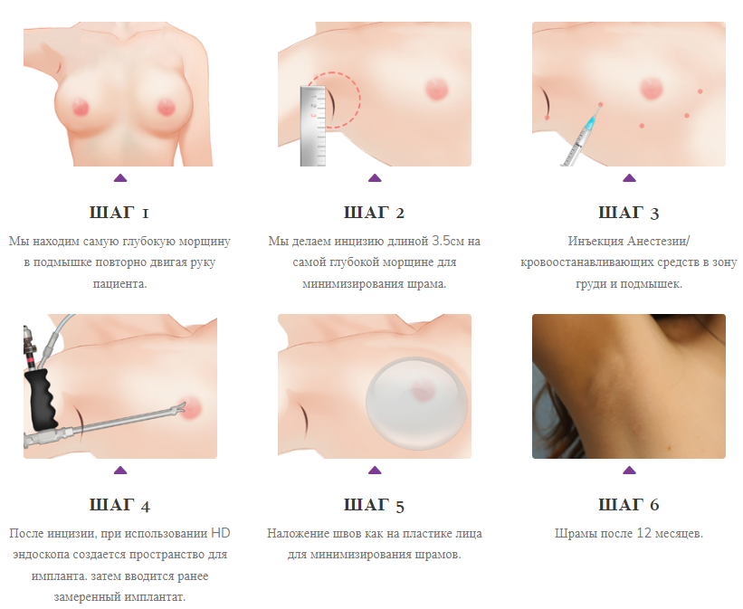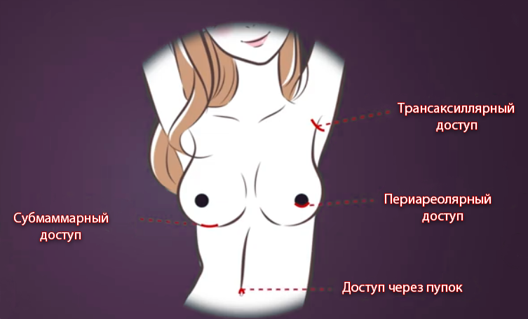 Существует четыре основных доступа установки импланта: 1) субмаммарный разрез (подгрудный), 2) периареолярный разрез (доступ по краю ареолы), 3) трансаксиллярный разрез (подмышечный) и 4) Доступ через пупок.