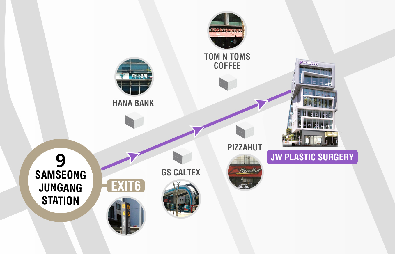Линия #9 150 метров пешком, выйдя из 6-го Выхода метро, станции Samseong Jungang (Линия 9) > Центр Пластической Хирургии JW  3-7 этаж