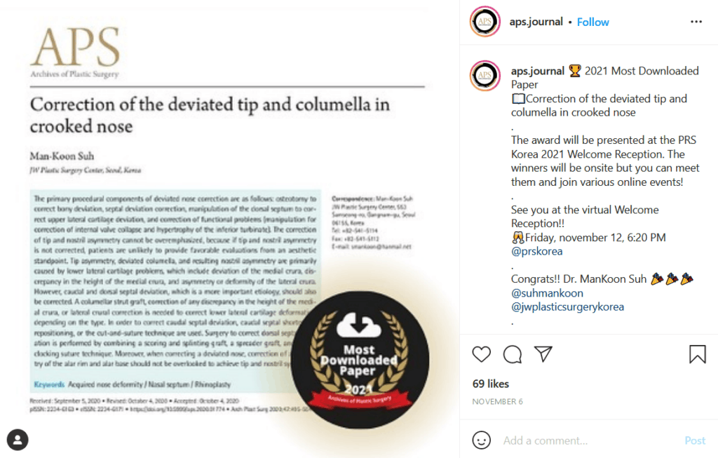 Директор нашей клиники и специалиста по пластике носа доктора Со Ман Гун получил награду. Доктор Со был награжден премий от APS @aps.journal в категории “Самая загружаемая статья”. Статья доктора Со была на тему “Коррекция искривленного кончика и колумеллы”.