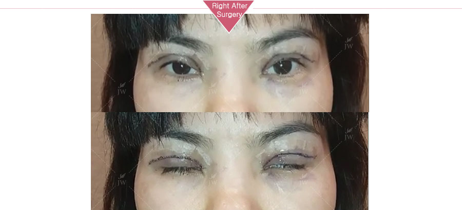 This picture is 2 days after my surgery. If you take a close look, you can see squared pieces of tape along my eyelids. This was to help the new double eyelids to settle on the new desired lines. JW provided me a deswelling treatment, so I made sure to keep visiting JW to get it.