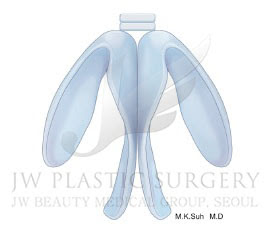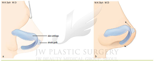 The cartilage harvested from ear or nasal septum is most frequently used and the width at the upper part is set to be about 6~8mm to display the tip defining point. The border area is made to be more inclined to display smooth curve after the surgery. In general, it is placed about 2~3mm is above the alar dome for better projection but in case of Koreans it is maximized. For those with thick skin and thin cartilage, the back of the grafted cartilage is reinforced by conducting additional cartilage graft to prevent tilting backward. By doing so, better result can be achieved.