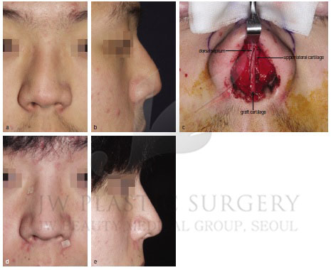 surgeon since it allows accurate formation of the graft shape and nasal tip. For this reason, this method is favorable for rhinoplasty among Asians and it has wide range of application once this method is familiar. However, the nasal tip becomes hard with less mobility. As for the materials of septal extension graft, nasal septal cartilage is widely used but autogenous rib cartilage or homologous rib cartilage can be used as well. If the size of the harvested nasal septum cartilage is insufficient, the effect of the septal extension graft may be unsatisfactory.