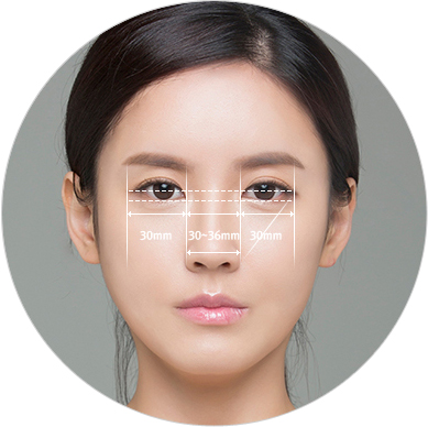 Идеальное соотношение высоты и длины глаз – это когда длина одного глаза примерно 30 мм, а длина между глазами, длина носовых пазух и длина переносицы одинаковая (примерно 30 ~ 36 мм). А также если можно провести прямую линию, соединяя между собой внешний уголок брови, внешний уголок глаза и уголка крыльев носа. Высота глаза считается идеальной, если видно 80-90% зрачка (около 8 ~ 10 мм).