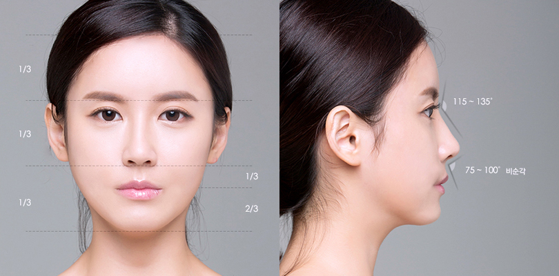 Длина обычного носа должна составлять одну треть общей длины лица, а угол между кончиком носа и губами 95-105 градусов.