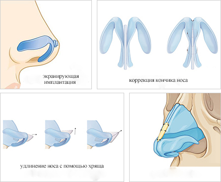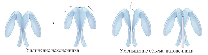 За счет перемещения хрящевой ткани кончика носа, возможно поднять или удлинить нос, сузить кончик носа и т.д.