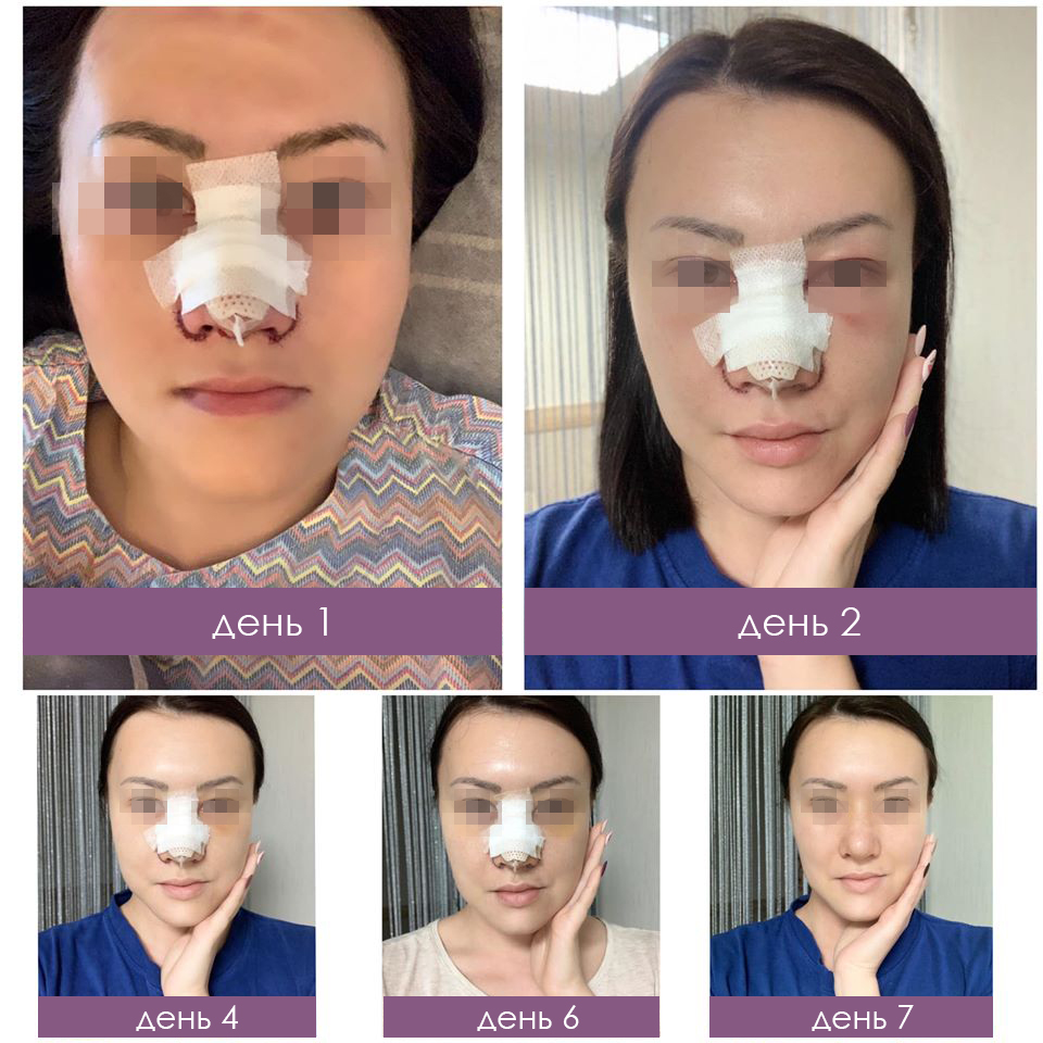 Ходила в повязке( или лангет, сори, незнаю как точно назвать)и швах я всего 7дней! Удивительно, что в Корее период реабилитации очень короткий! За эти 7 дней я приезжала в клинику 2 раза:чтобы снять «тампоны» с ноздрей и провести лучевую терапию от отеков и на 7 день, снять швы и также на терапию. Кстати отеки были небольшие , что тоже очень удивило. При необходимости по желанию, если отеки большие, можно приезжать в клинику чаще на терапию, но, к счастью мне не пришлось часто.